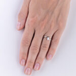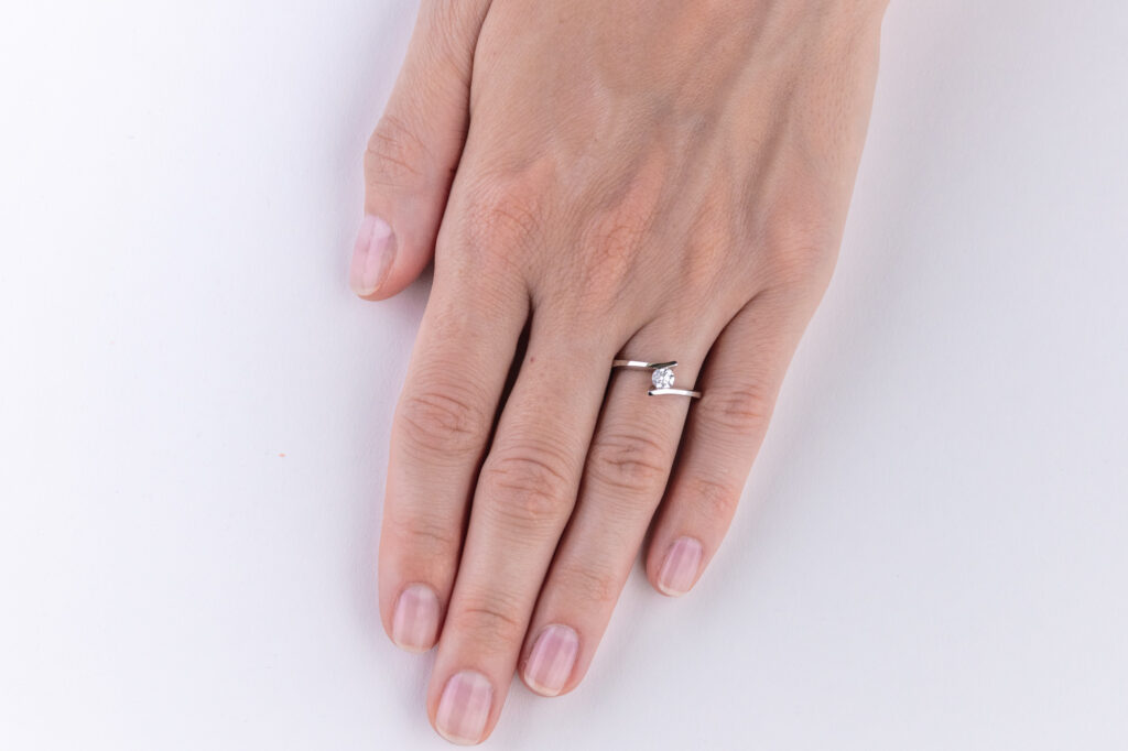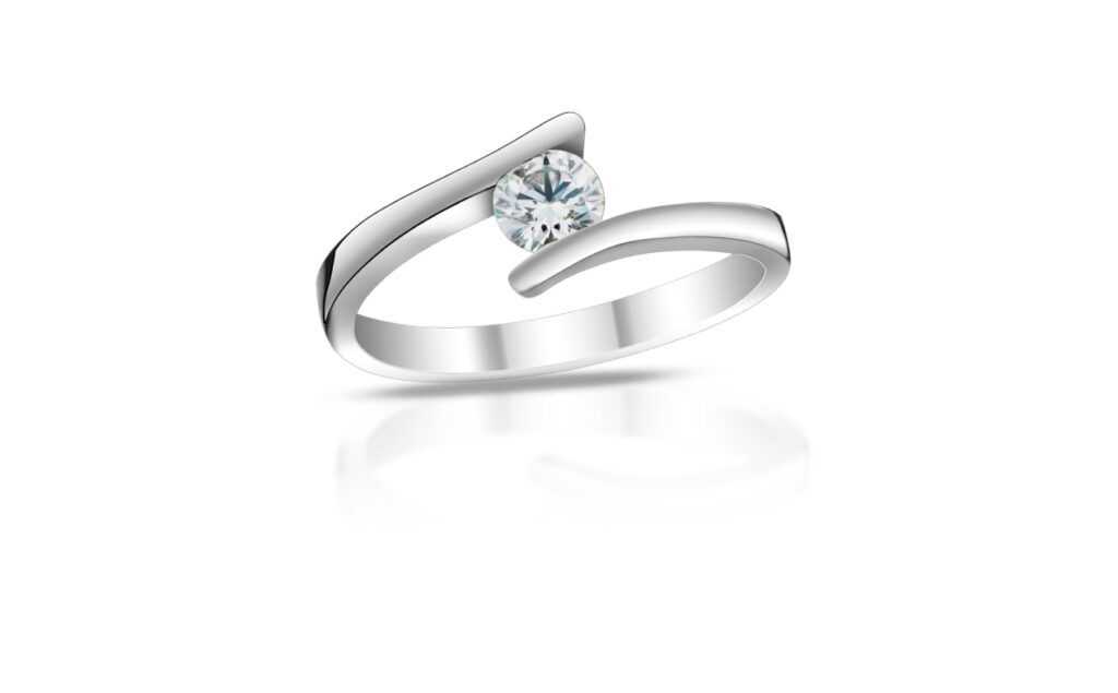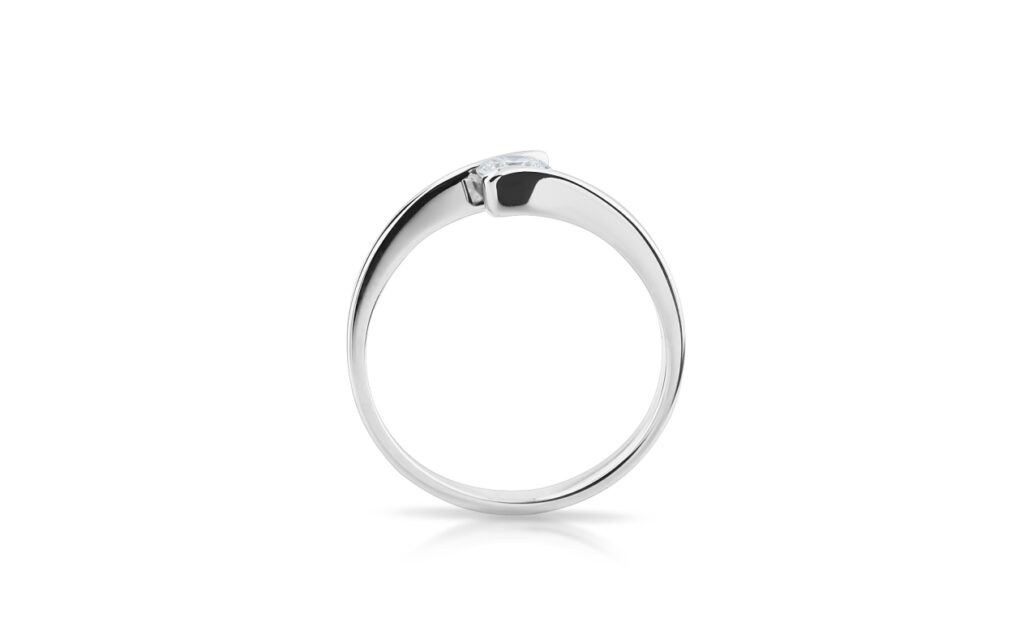 Nádherný model diamantového šperku tvořený elegantní linkou, která svírá osazený diamant z protilehlých stran. Zlatá obroučka tak pouze prochází podél centrálního drahokamu a narozdíl od běžných prstenů se neprotíná. Aby bylo zamezeno nechtěné ztrátě diamantu, je ve skutečnosti proveden důmyslný skrytý spoj v centrální části šperku, tedy pod samotným drahokamem.