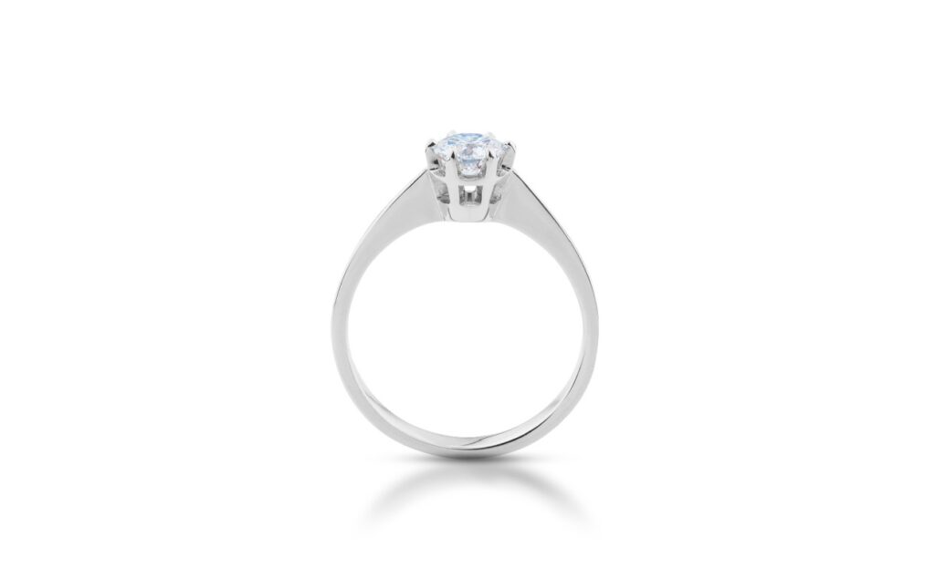 Nádherná alternativa klasického designu diamantového prstenu, obohacená o vyvyšující se zlatou linii obroučky šperku, směřující pohled přímo k jeho nepřehlédnutelné koruně, tvořené šesti pevnými krapnami bezpečně svírajícími centrální briliant. Tento jedinečný prvek osazený přírodním diamantem tak tvoří neopominutelnou dominantu celého šperku, který může nalézt uplatnění nejen jako zásnubní prsten.