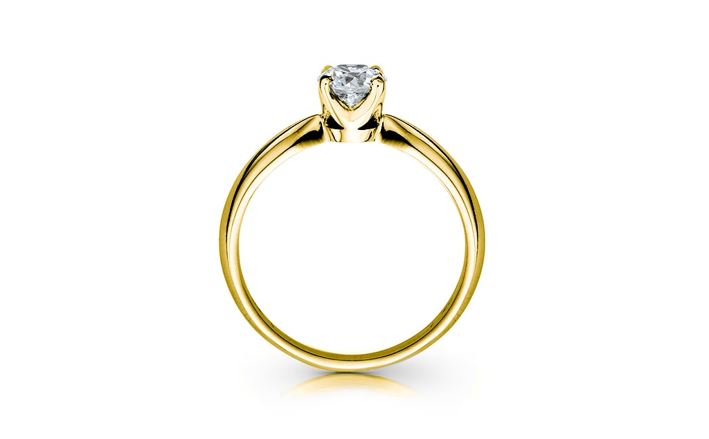 Dokonalý model diamantového prstenu, který upoutá svou výraznou, avšak neokázalou korunou tvořenou čtyřmi pevnými krapnami vyzdvihujícími mezinárodně certifikovaný diamant do prostoru nad šperkem. Jemným profilem rozdělená linie obroučky prstenu se záměrně ke kvadratické koruně zužuje a díky využití optických zákonitostí působí diamant pro pozorovatele větším dojmem, než ve skutečnosti je.