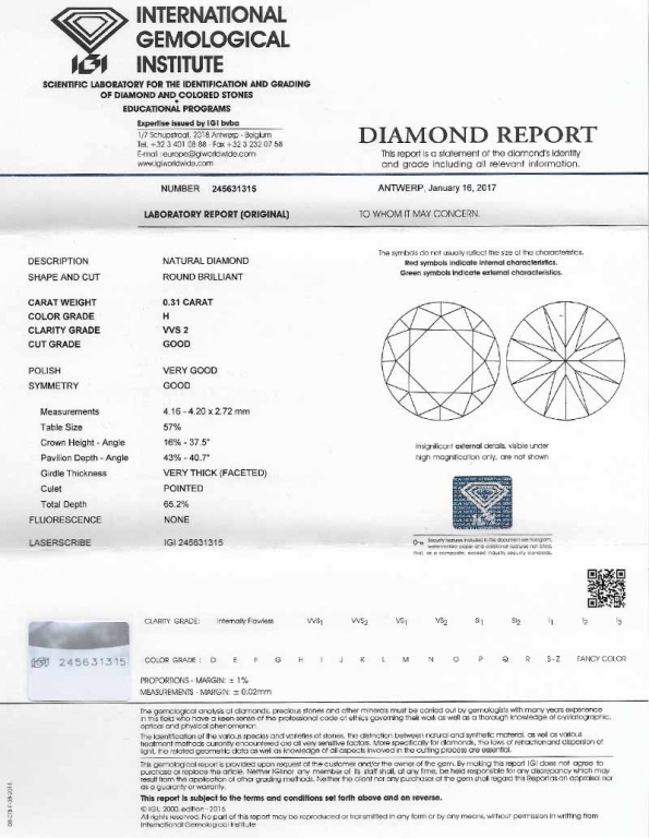 Prsten je zhotoven ve 14ti karátovém bílém zlatě a je opatřen mezinárodně uznávaným certifikátem IGI. Diamant je navíc laserově číslován laboratoří IGI.