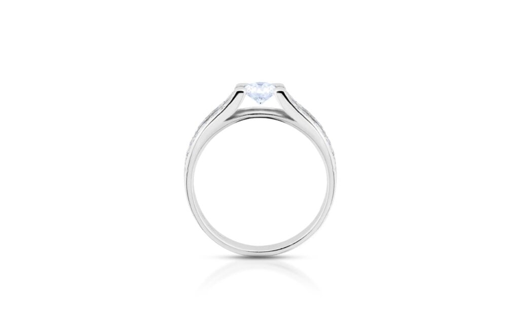 Velmi výrazný model diamantového prstenu, který nabízí netradiční osazení drahokamu přímo v jeho obroučce. Ta je ve své polovině rozdělena do čtyř ramen výrazně zdobených přírodními diamanty, jež zároveň plní funkci upevnění diamantu v místě korunky šperku. Díky tomuto typu osazení si může jeho nositelka užívat pohled na drahokam také z boku, tedy pohledu, jež klasické korunky diamantových šperků nenabízí.