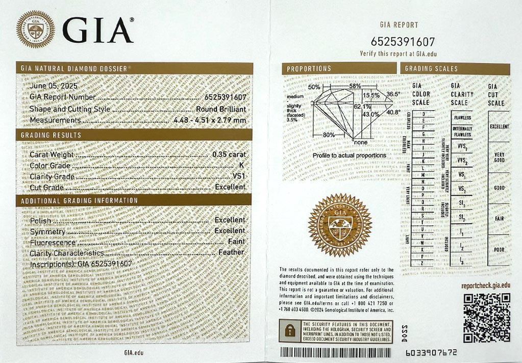 Pro snazší ověření pravosti diamantu označila laboratoř GIA jeho hranu vlastní mikroskopickou laserovou inskripcí.