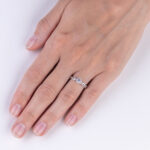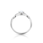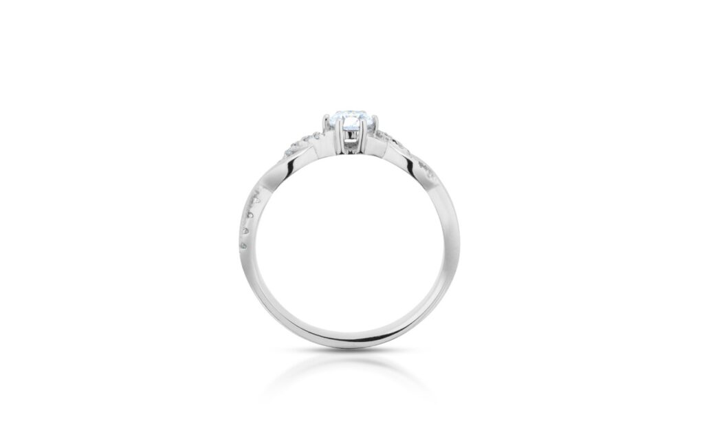 Model diamantového šperku, který nabízí dokonalé spojení precizní klenotnické práce a něžné elegance. Obroučka prstenu je ve své pohledové polovině tvořena dvěma společně propletenými paprsky, kdy jeden je zdoben celkem 22 kusy milimetrových necertifikovaných diamantů. Dominantou šperku je jeho koruna ze šesti krapen osazená centrálním diamantem briliantového brusu.