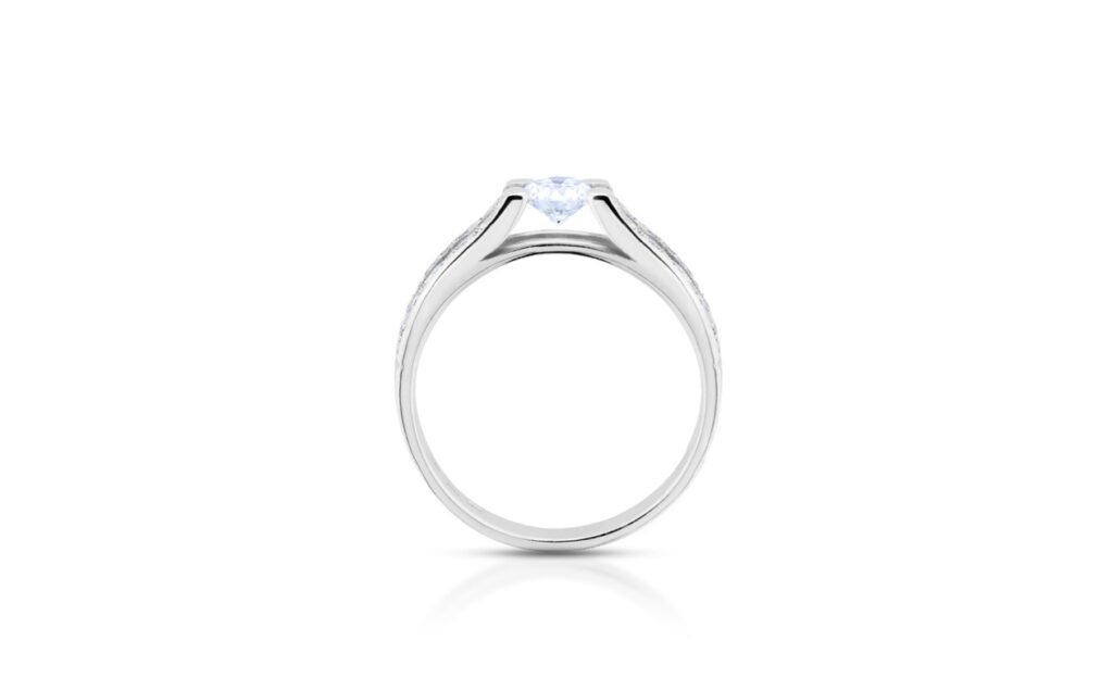 Velmi výrazný model diamantového prstenu, který nabízí netradiční osazení drahokamu přímo v jeho obroučce. Ta je ve své polovině rozdělena do čtyř ramen výrazně zdobených přírodními diamanty, jež zároveň plní funkci upevnění diamantu v místě korunky šperku. Díky tomuto typu osazení si může jeho nositelka užívat pohled na drahokam také z boku, tedy pohledu, jež klasické korunky diamantových šperků nenabízí.