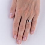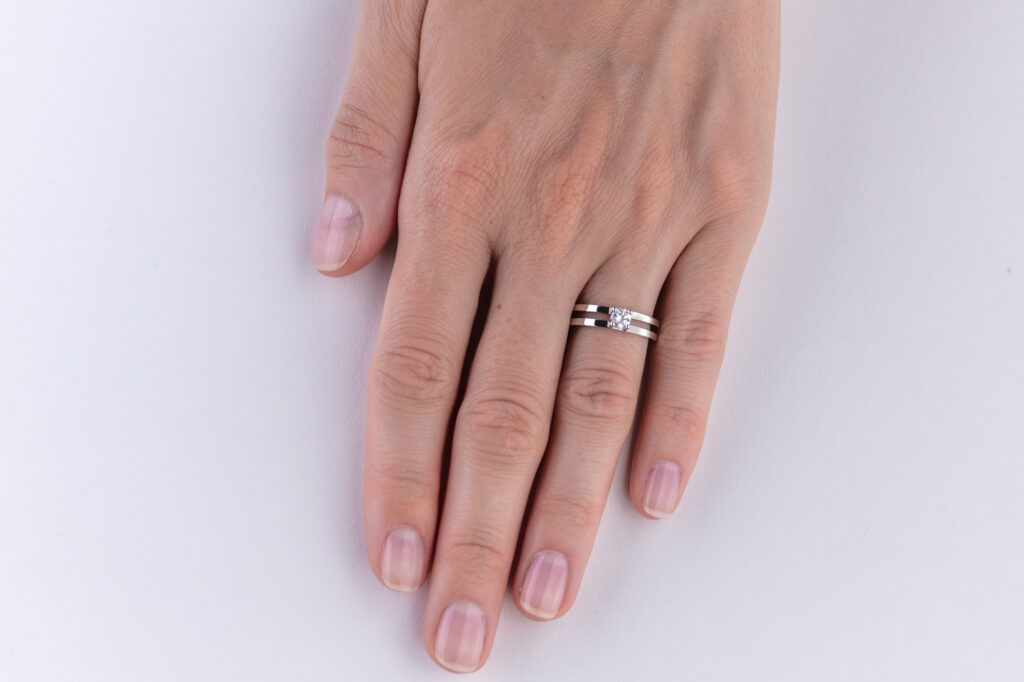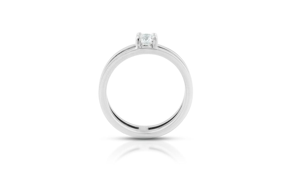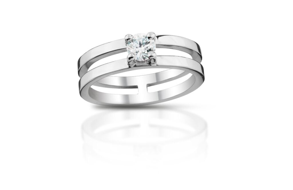 Velmi nápadný diamantový prsten sestavený ze dvou protilehlých symetrických obrouček, které ve svém středu elegantně svírají usazený diamant. Ten je uchycen v jednoduchém lůžku tvořeném ze čtyř jemných krapen, jež nenarušují čistotu celého šperku. Vzhledem k typu obroučky je možné tento prstenu použít pro mnohé příležitosti, a to i za použití diamantů z nižších hmotnostních kategorií.