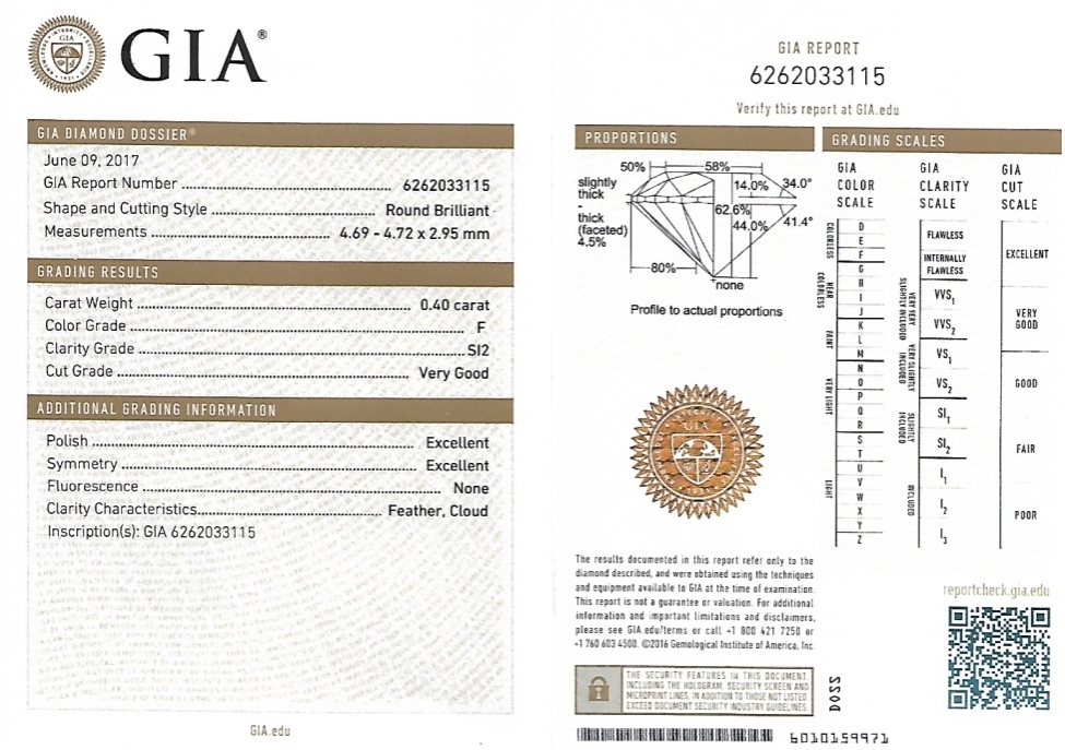 Prsten je zhotoven ve 14ti karátovém bílém zlatě, osazen 6ks 1.20mm diamantů a je opatřen mezinárodně uznávaným certifikátem GIA. Diamant je navíc laserově číslován laboratoří GIA.