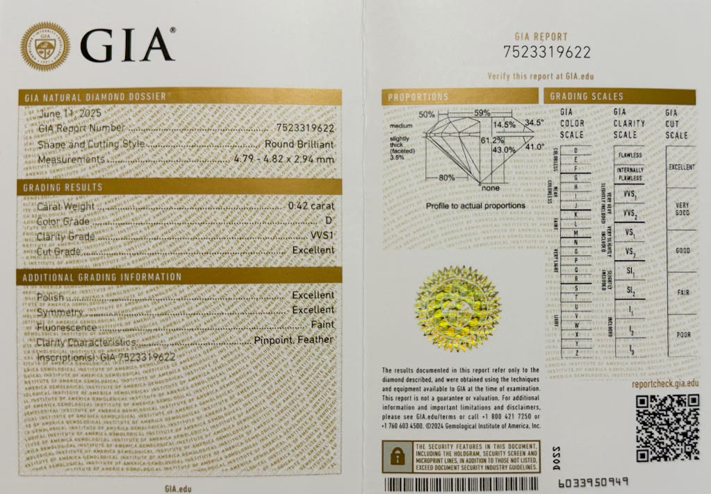 byl založen v roce 1931 a patří k absolutní špičce mezi gemologickými laboratořemi po celém světě a dodržuje pravidla stanovená Diamond High Council v plném rozsahu. Všechny diamanty na stránkách VVDiamonds opatřeny certifikátem GIA, lze verifikovat na stránkách GIA. Většina diamantů je laserově číslována pro větší bezpečnost obchodu.