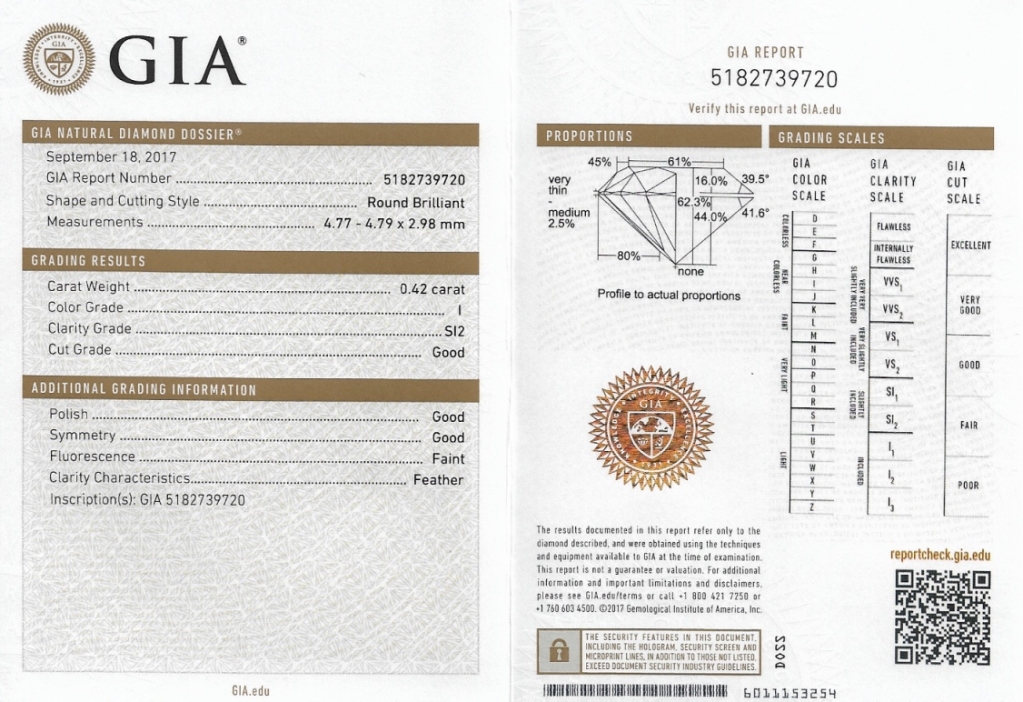 Prsten je zhotoven v 18ti karátovém žlutém zlatě. Diamant je včetně certifikátu GIA a má na své rundistě laboratoří GIA vylaserové číslo certifikátu.