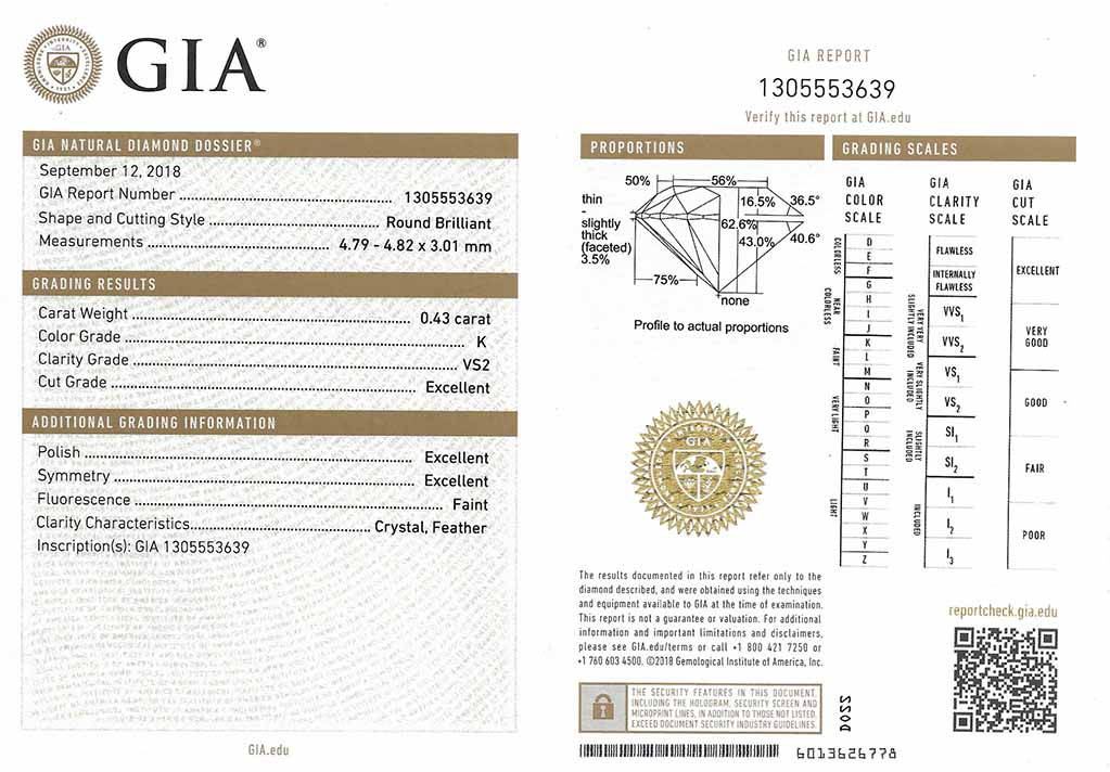 Prsten je zhotoven ve 14ti karátovém bílém zlatě a je opatřen mezinárodně uznávaným certifikátem GIA. Diamant je navíc laserově číslován laboratoří GIA.