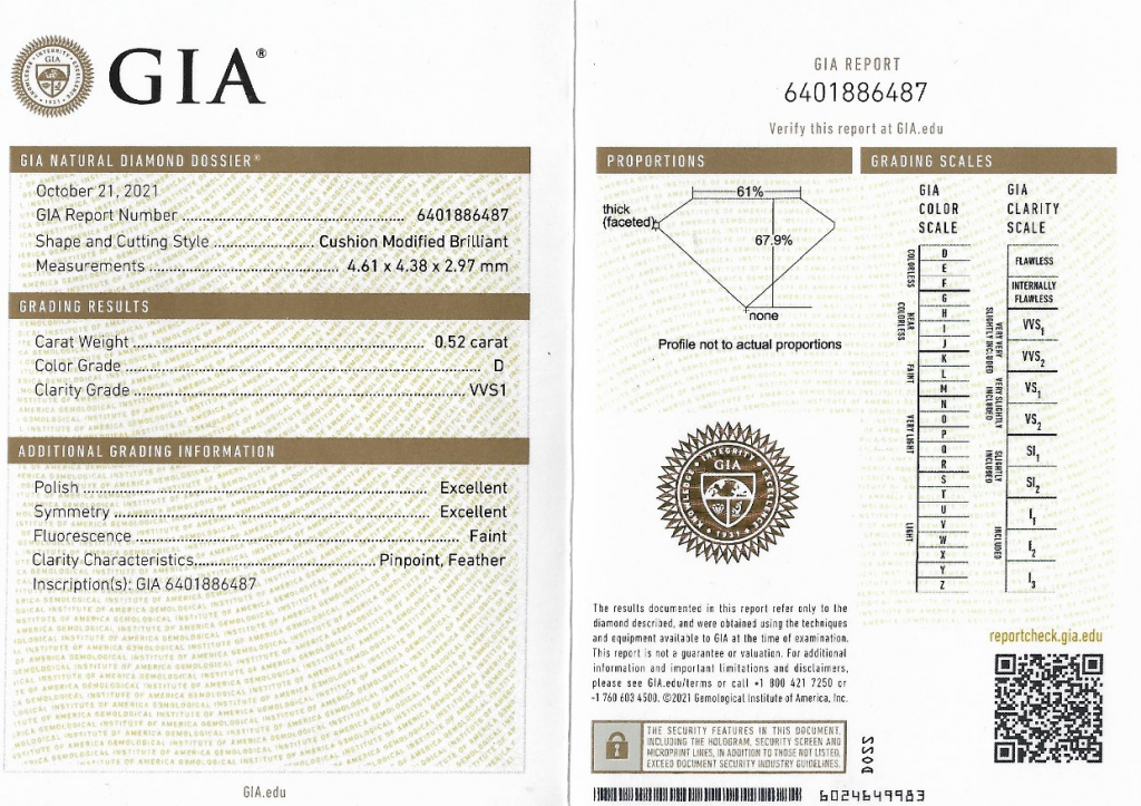 Centrální diamant je opatřen mezinárodně uznávaným certifikátem GIA. Diamant je navíc laserově číslován laboratoří GIA.